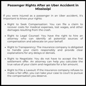 - Right to legal counsel: While hiring an attorney is not required to file an Uber accident claim in Mississippi, a lawyer can help identify all potential sources of compensation and provide solid advocacy while you recover.